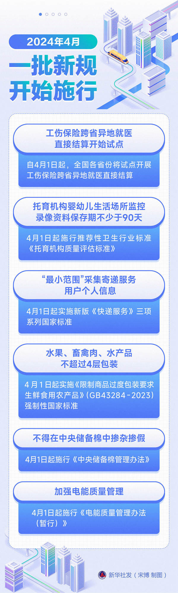 工伤保险跨省异地就医直接结算开始试点,托育机构监控录像资料保存期不少于90天,多措并举保护快递用户个人信息……2024年4月,一批将要施行的新规带来美好生活新愿景。