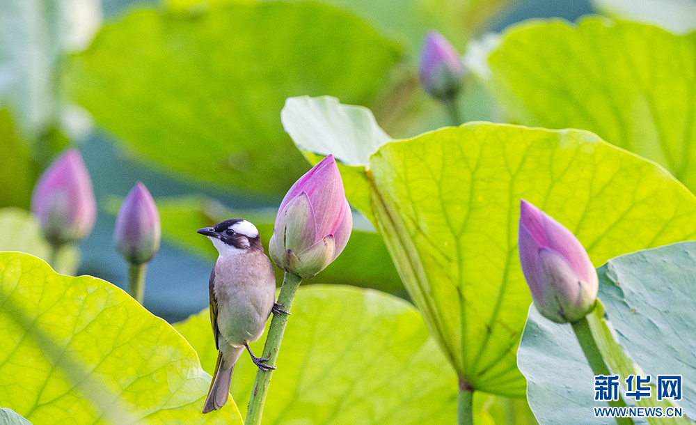 仲夏时节,安徽省淮北市桓谭公园的荷花竞相绽放,散发淡淡幽香。鸟儿、蜜蜂穿梭其间,成为夏日里一道生态美景。新华网发(王文 摄)