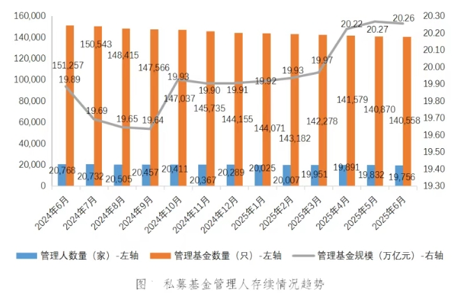 截至2025年6月末,存续私募基金140558只,存续基金规模20.26万亿元。其中,存续私募证券投资基金83356只,存续规模5.56万亿元;存续私募股权投资基金30201只,存续规模10.95万亿元;存续创业投资基金26144只,存续规模3.41万亿元。(记者刘羽佳)