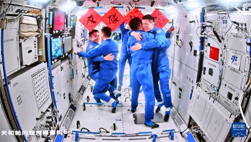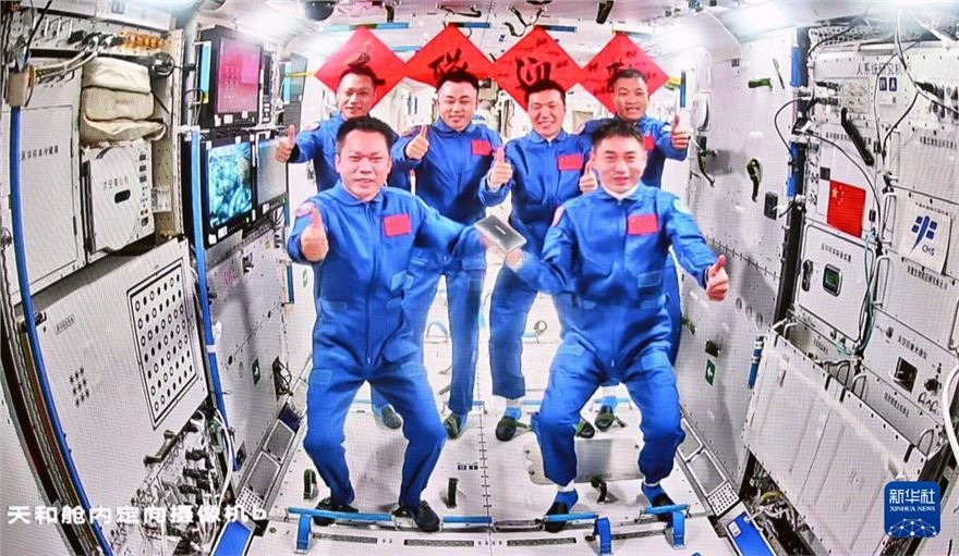 这是4月26日在北京航天飞行控制中心拍摄的神舟十七号航天员乘组和神舟十八号航天员乘组“全家福”。