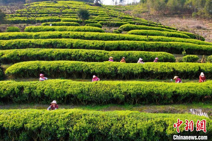茶农们腰挎竹篓穿梭在茶叶梯田间,双手上下飞舞,娴熟地采摘着今年的第一茬嫩芽。永定区融媒体中心供图