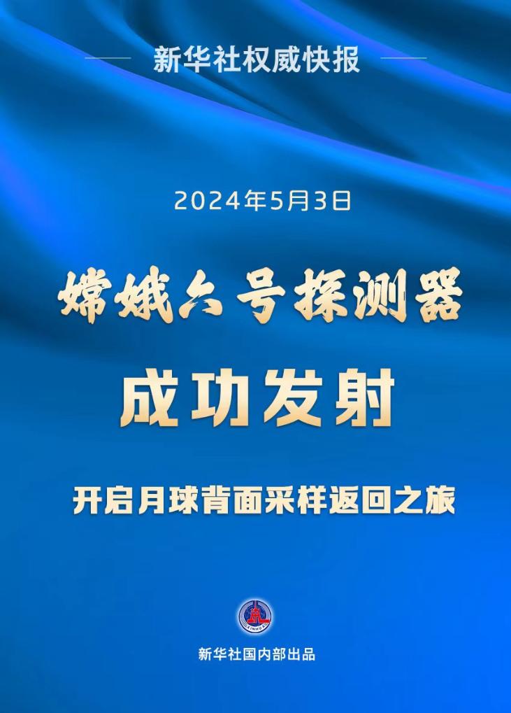 新华社海南文昌5月3日电 5月3日17时27分,嫦娥六号探测器由长征五号遥八运载火箭在中国文昌航天发射场成功发射,之后准确进入地月转移轨道,由此开启世界首次月背“挖宝”之旅。