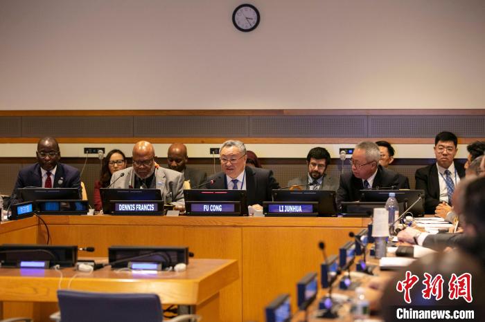 当地时间4月17日,全球发展倡议之友小组高级别会议在纽约联合国总部举行。图为中国常驻联合国代表傅聪(中)主持会议。 中新社记者 王帆 摄