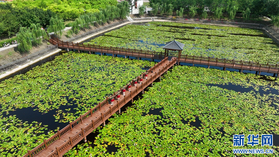 莲叶田田,行人依依,栈桥、凉亭、荷塘,构成乡村美景(无人机照片)。新华网发(董乃德 摄)
