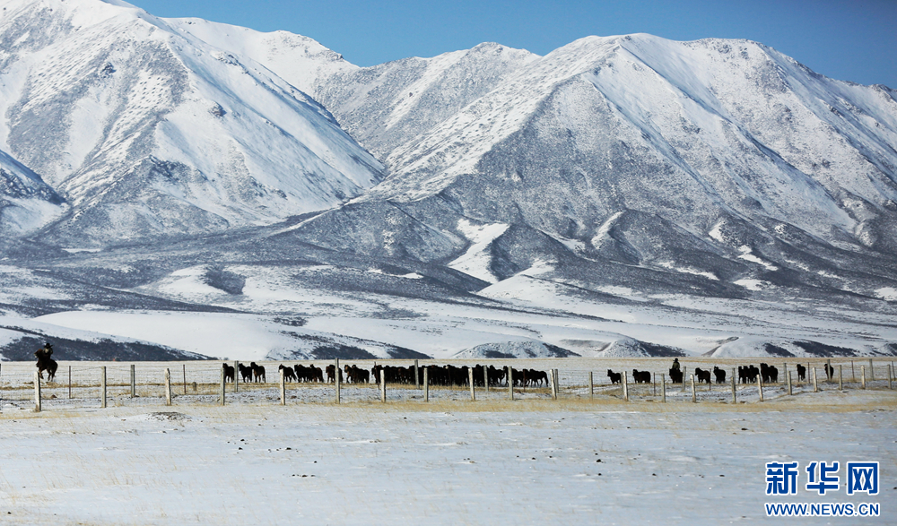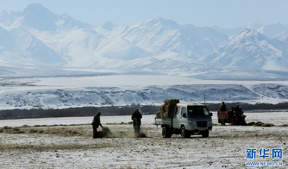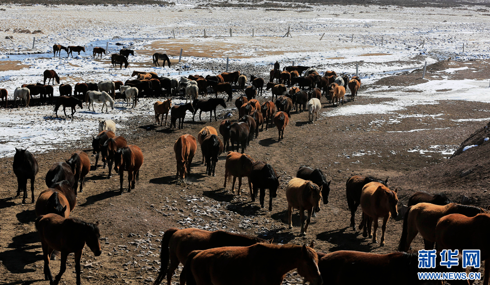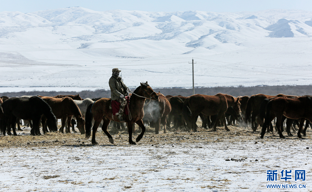 仲春时节,甘肃山丹马场牧工为马群拉草补饲草料,牧马人赶着马群在雪地草原上行走,构成一幅美丽的春日雪原牧马图。新华网发(陈礼 摄)