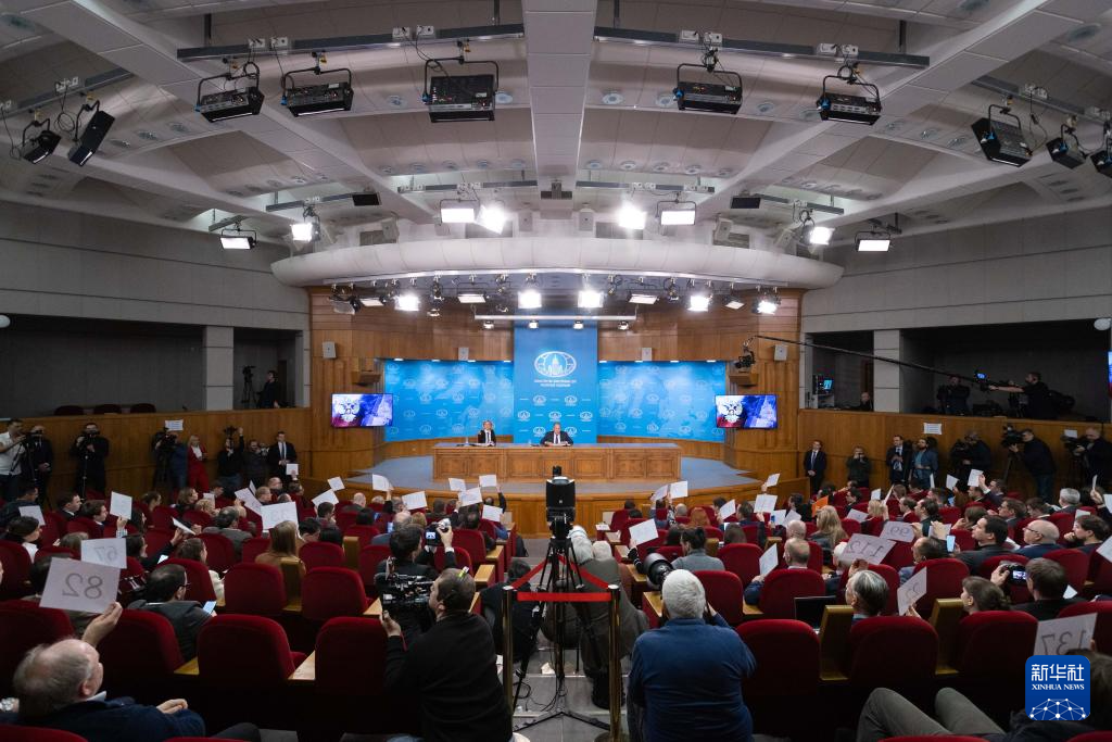 1月14日,在俄罗斯首都莫斯科,媒体记者举手提问。新华社记者 白雪骐 摄