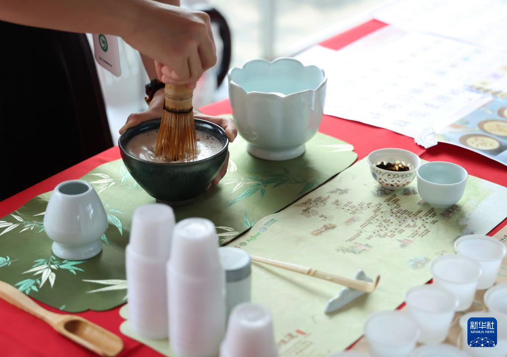4月22日,在巴西米纳斯吉拉斯联邦大学举行的“万里茶道与咖啡之路”特别巡展中,志愿者展示点茶技艺。新华社记者 金皓原 摄