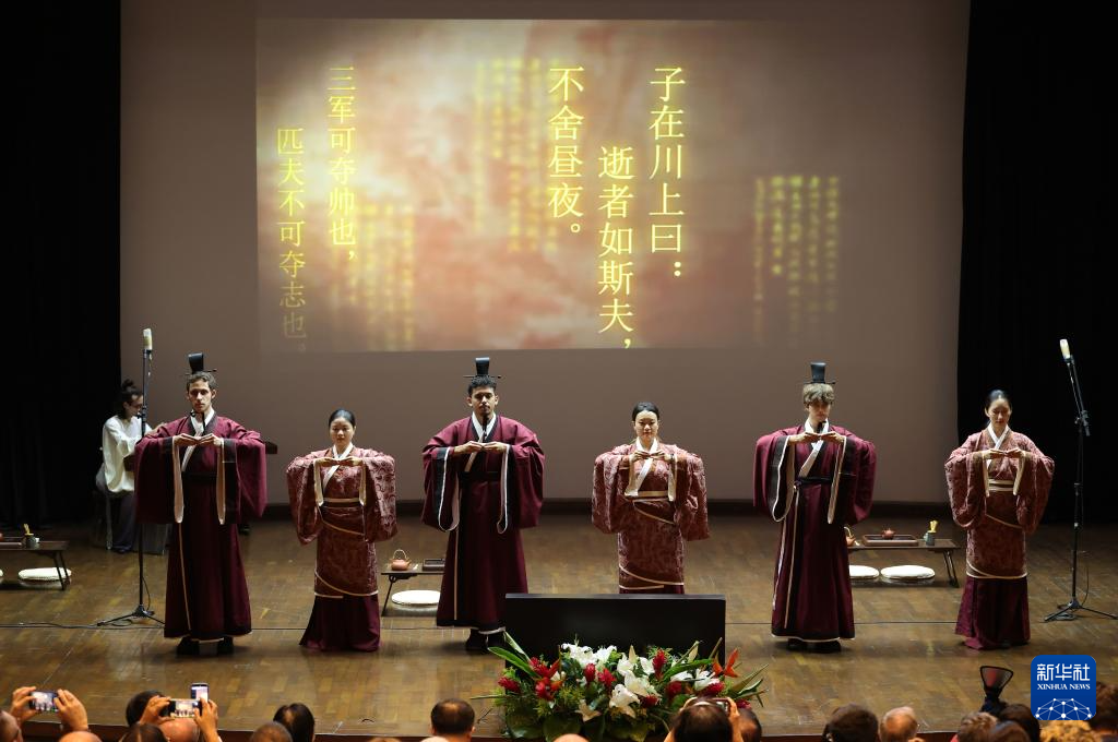4月22日,在巴西米纳斯吉拉斯联邦大学举行的“万里茶道与咖啡之路”特别巡展开幕活动中,演员展示茶礼文化。新华社记者 金皓原 摄