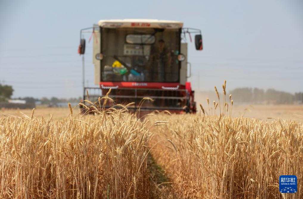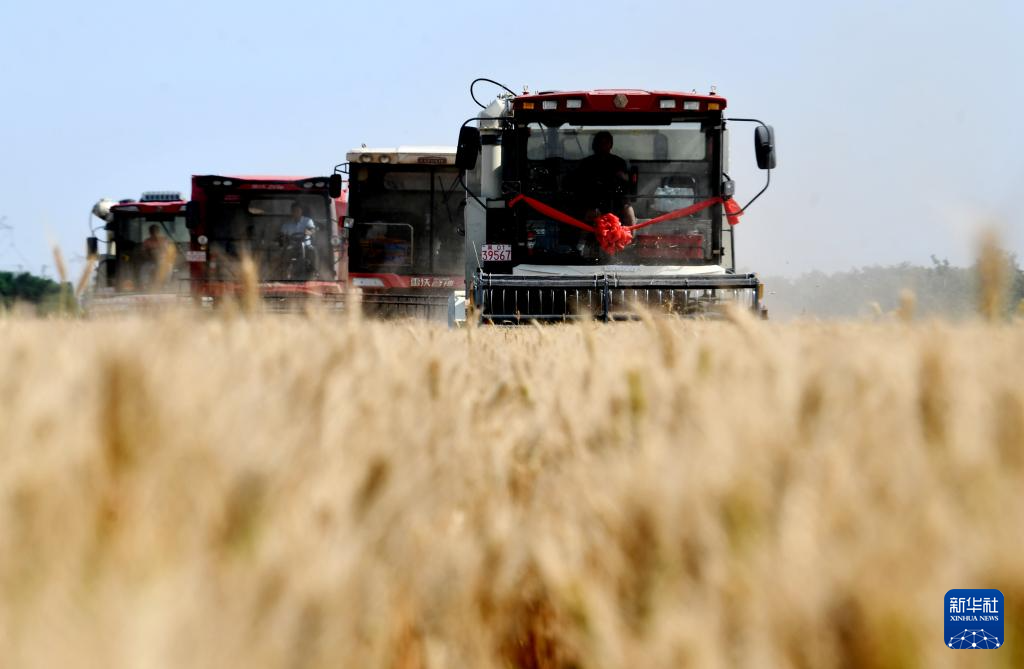 6月10日,联合收割机在河北省石家庄市栾城区柳林屯乡东牛村麦田里收割。新华社发(李明发 摄)