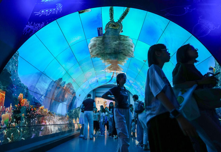 游客在澄江化石地世界自然遗产博物馆“寒武纪海底隧道”参观(7月15日摄)。新华社记者 陈欣波 摄