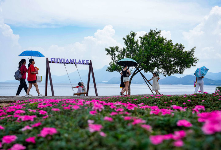 游客在抚仙湖边观光游览(7月16日摄)。新华社记者 陈欣波 摄