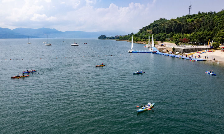 游客在抚仙湖上体验皮划艇(7月16日摄,无人机照片)。新华社记者 陈欣波 摄