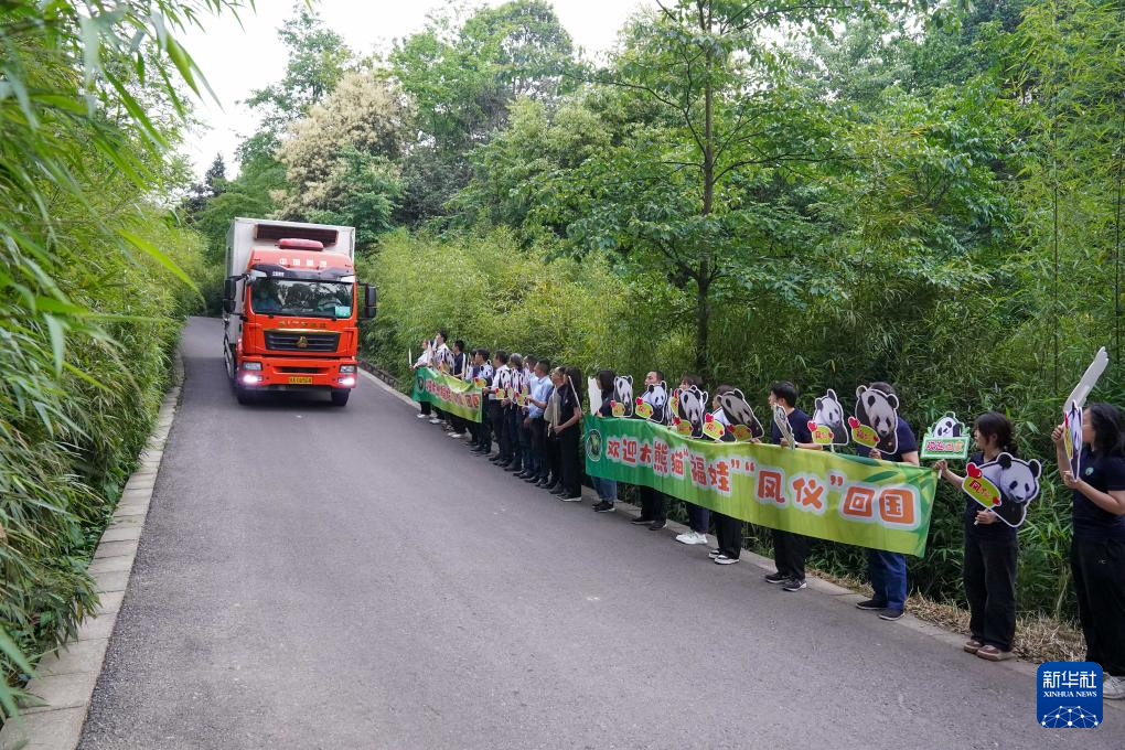 5月18日,在中国大熊猫保护研究中心雅安基地,熊猫中心职工欢迎大熊猫“福娃”“凤仪”回家。新华社发(李传有 摄)