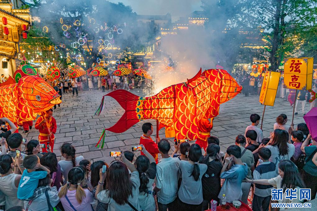 鱼灯队伍吸引游客驻足。新华网发