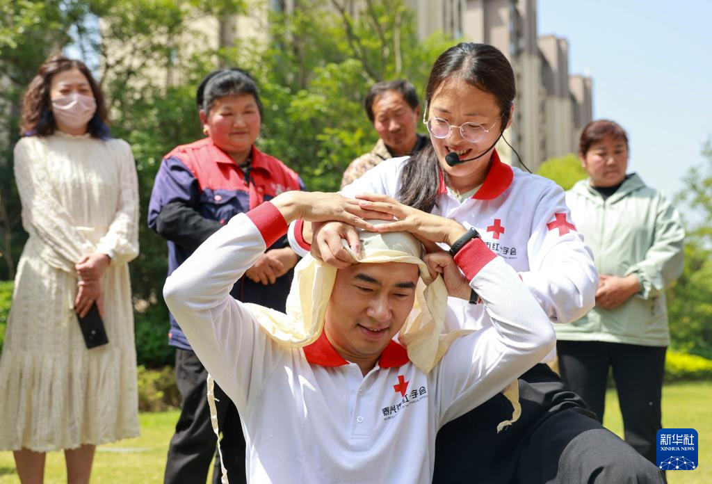5月7日,在江苏省泰兴市济川街道张陈社区燕澜花园睦邻点,泰兴市红十字会的工作人员传授创伤救护知识。