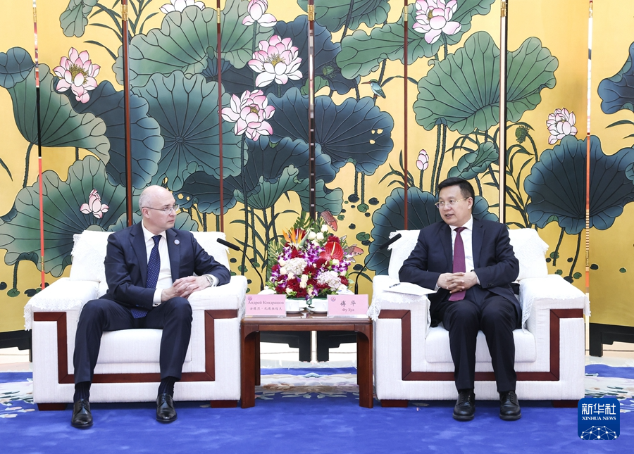 5月16日,新华社社长傅华在北京会见俄罗斯塔斯社社长安德烈·孔德拉绍夫。新华社记者 庞兴雷 摄