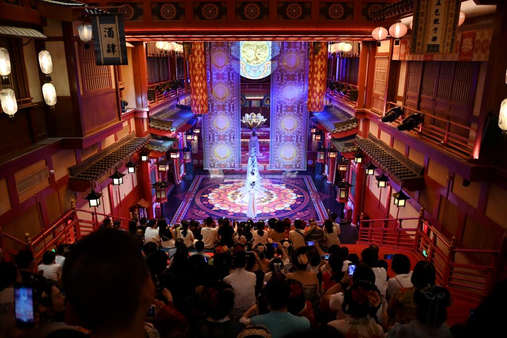 2024年5月12日,游客在西安长安十二时辰主题街区内观看演出。新华社记者李一博 摄