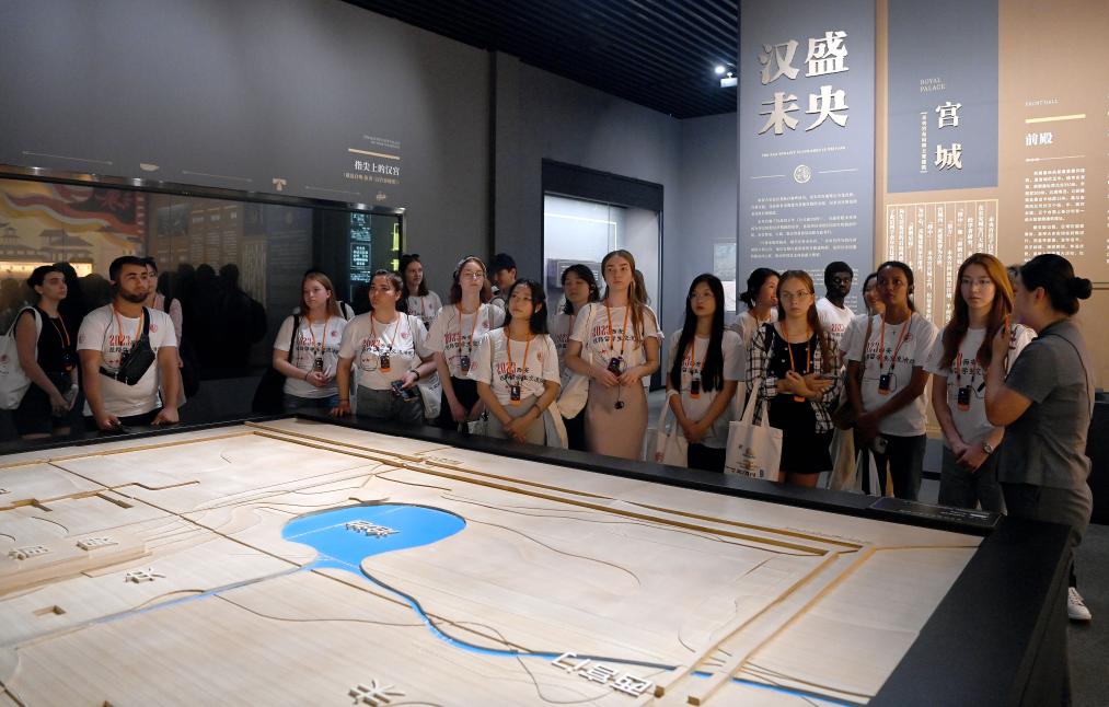2023年9月16日,外国留学生在西安未央区汉长安城遗址内的汉长安城历史文化与遗址保护展示厅参观。新华社记者刘潇 摄