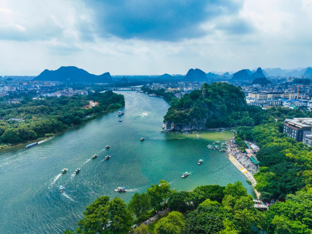 在桂林象鼻山景区一带,游客乘船游览漓江(无人机照片)。新华社发(刘峥 摄)