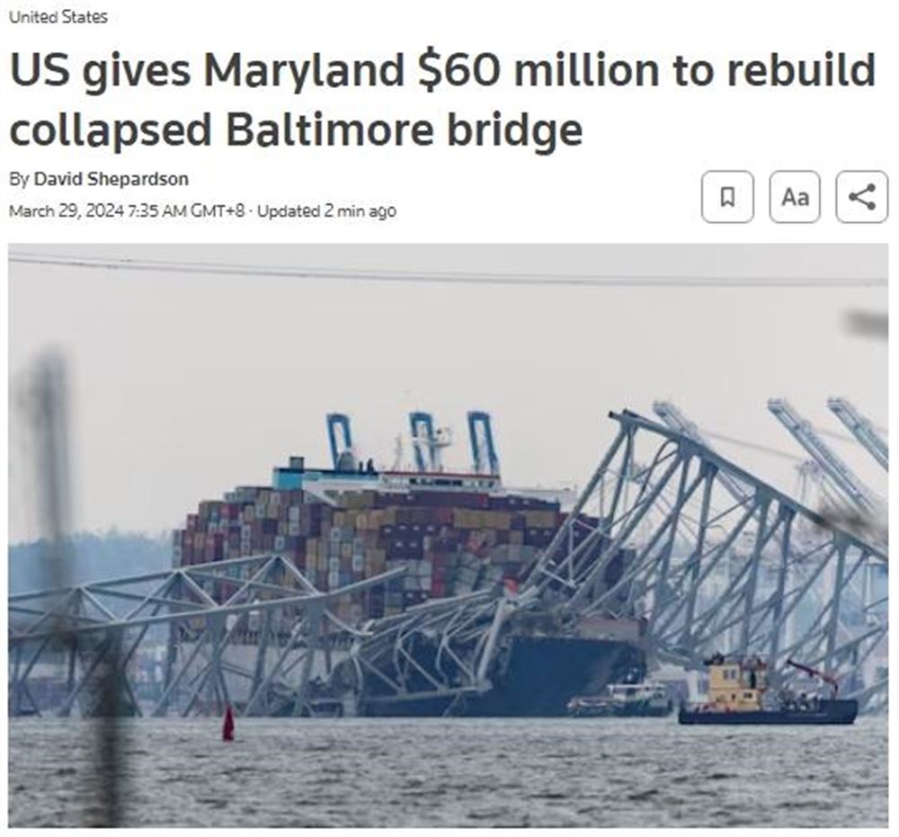 中新网3月29日电 据路透社消息,当地时间28日,美国联邦政府向马里兰州拨款6000万美元,这笔款项将作为联邦紧急救援资金,用于重建在美东时间26日被撞击倒塌的巴尔的摩弗朗西斯·斯科特·基大桥。