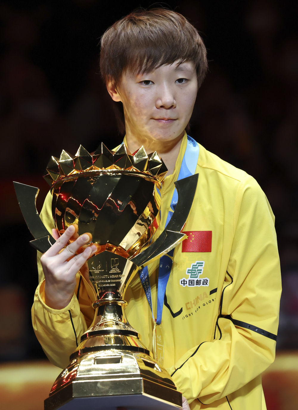 2月23日,王曼昱在颁奖仪式上与奖杯合影。当日,在广东深圳举行的第34届国际乒联-亚乒联盟亚洲杯女子单打决赛中,中国选手王曼昱4:0战胜队友孙颖莎,夺得冠军。新华社记者 卢汉欣 摄