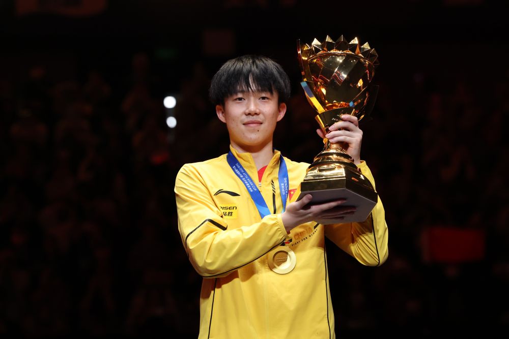 2月23日,王楚钦在颁奖仪式上捧杯。当日,在广东深圳举行的第34届国际乒联-亚乒联盟亚洲杯男子单打决赛中,中国选手王楚钦4:0战胜队友梁靖崑,夺得冠军。新华社记者 梁旭 摄