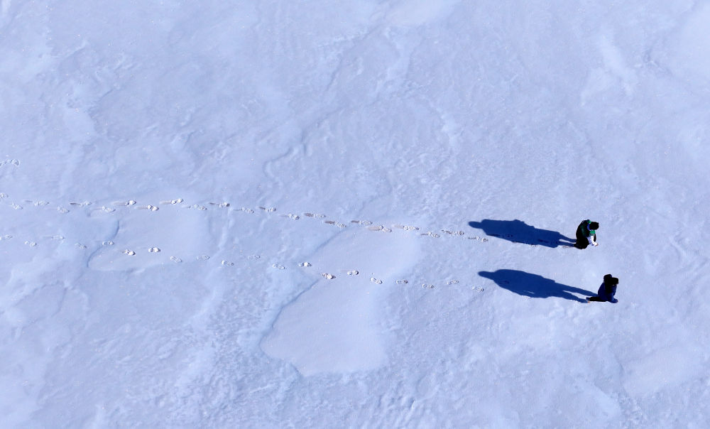 在青海省果洛藏族自治州玛多县黄河乡境内,两名生态管护员在开展生态巡护(2025年2月22日摄,无人机照片)。新华社记者 张宏祥 摄