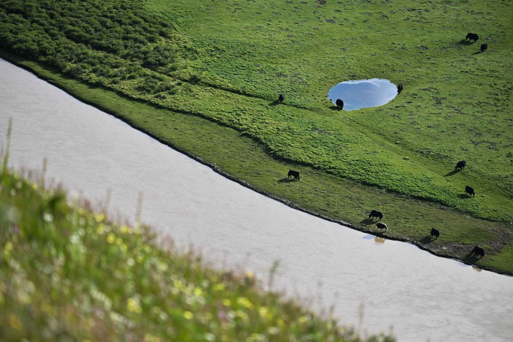一群牦牛在青海省果洛藏族自治州达日县境内的黄河岸边觅食(2024年7月31日摄)。新华社记者 李占轶 摄