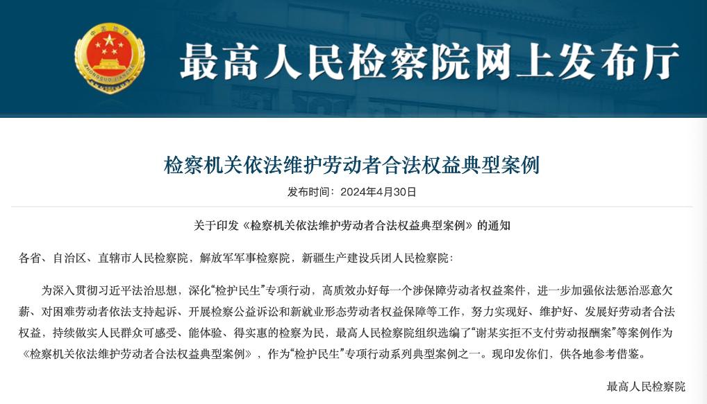 最高人民检察院4月30日发布了一批检察机关依法维护劳动者合法权益典型案例,并介绍了检察机关办理拒不支付劳动报酬犯罪案件等方面情况。数据显示,一季度全国检察机关通过办案追讨欠薪2700余万元。