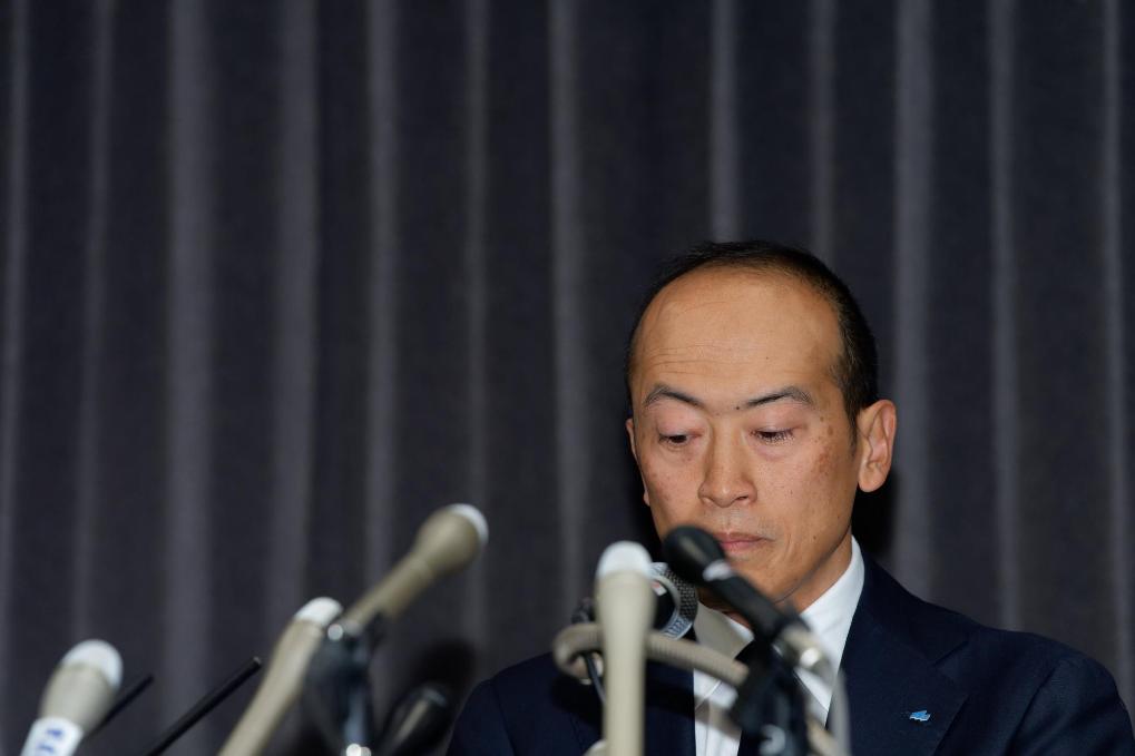 3月29日,小林制药公司社长小林章浩(左二)及相关负责人在日本大阪举行的新闻发布会上鞠躬。新华社记者张笑宇摄