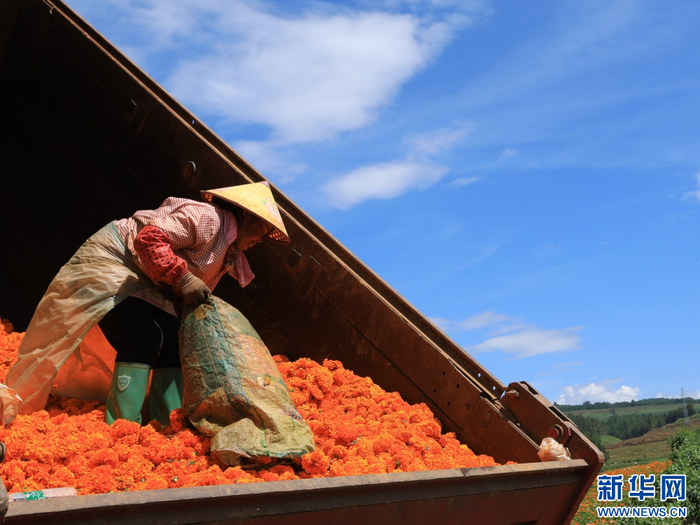8月5日,在云南省曲靖市陆良县活水乡雨麦红村,花农正忙着采收万寿菊。新华网发 (王勇 摄)