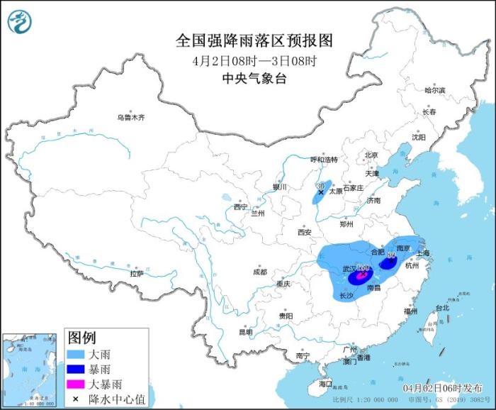 预计,4月2日08时至3日08时,湖北大部、河南南部、安徽南部、江苏南部、上海北部、湖南东北部、江西北部、浙江西北部等地部分地区有大到暴雨,其中,湖北东南部、湖南东北部、安徽东南部、江西东北部等地局地有大暴雨(100~150毫米)。上述部分地区伴有短时强降水(最大小时降雨量30~50毫米,局地可超过70毫米),局地有雷暴大风或冰雹等强对流天气。