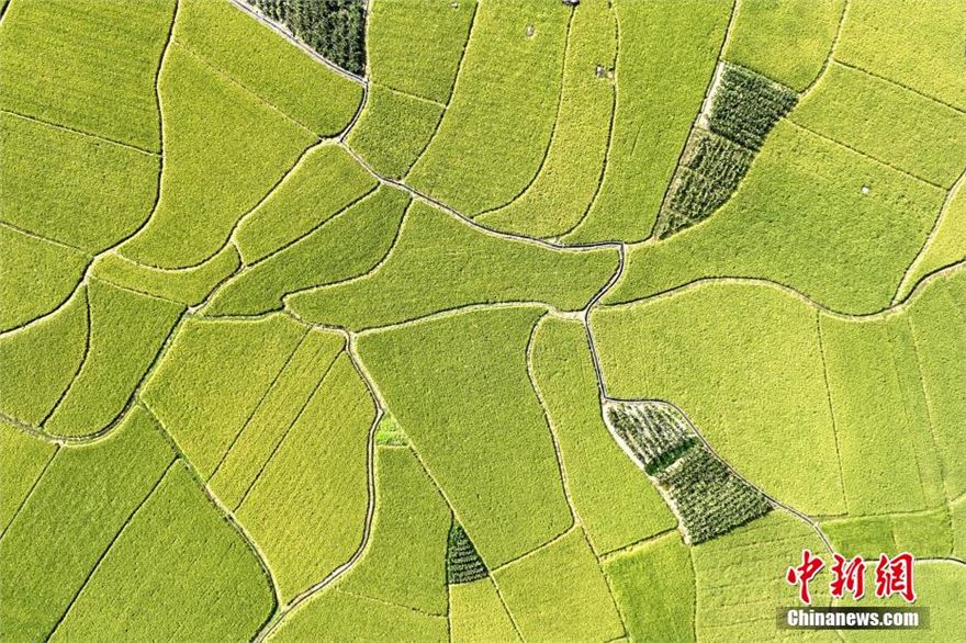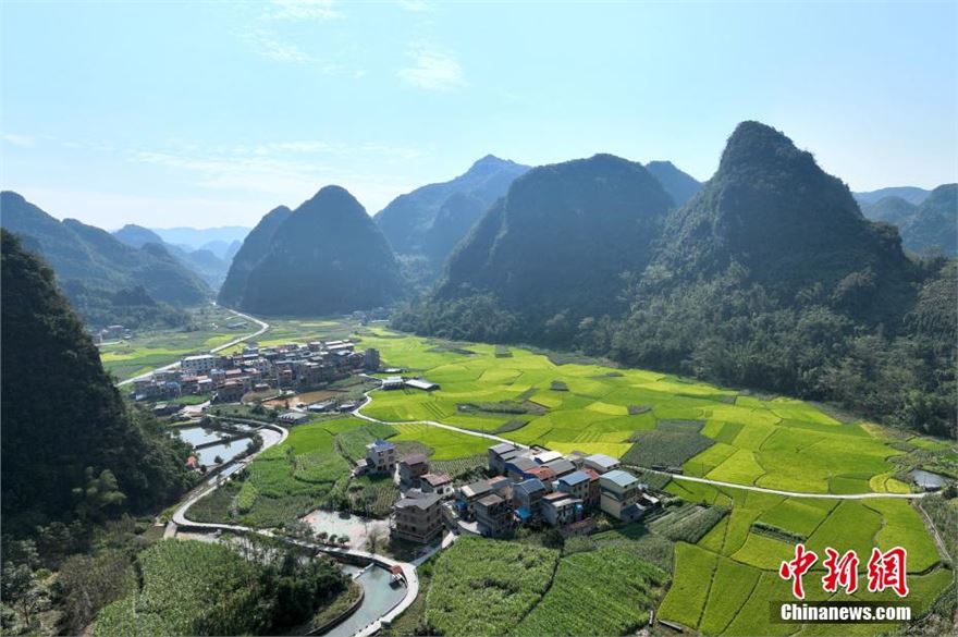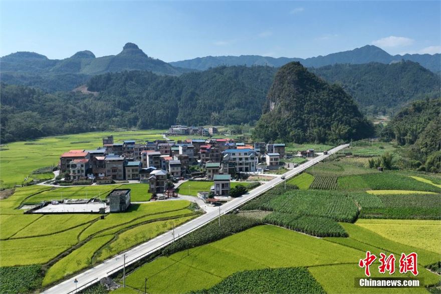 10月11日,在广西河池市罗城仫佬族自治县乔善乡板团村,泛黄的稻田与连绵的群山、通村公路、村庄民居、绿植相映成趣,构成一幅美丽的田园“丰”景。图为当地田园景色。