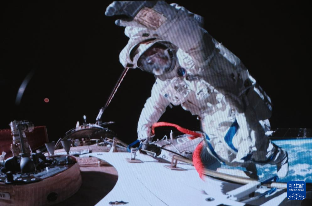 12月17日在北京航天飞行控制中心拍摄的神舟十九号航天员蔡旭哲在空间站组合体舱外工作的画面。新华社记者 李杰 摄