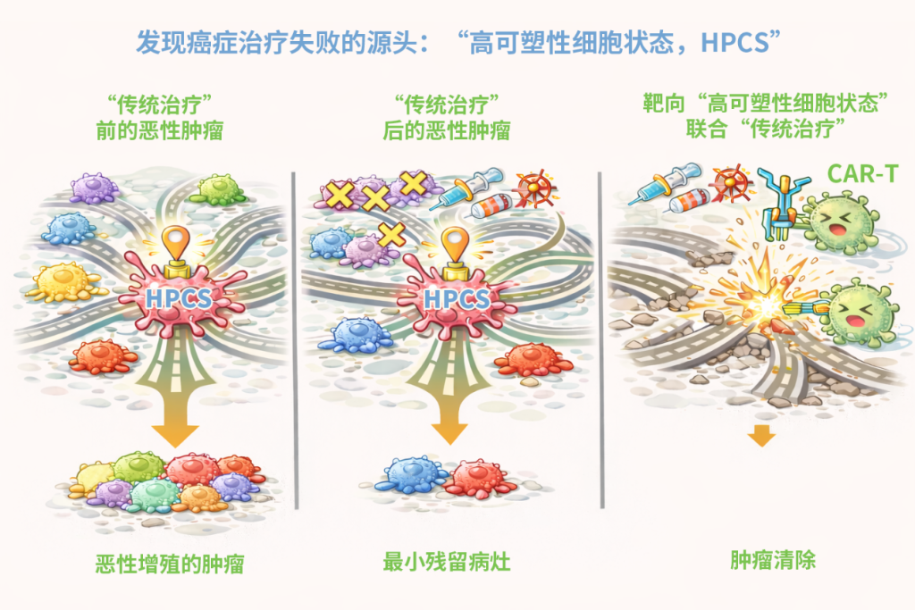 “高可塑性细胞状态”肿瘤细胞驱动癌症进展,造成治疗耐受的示意图。(研究团队供图)