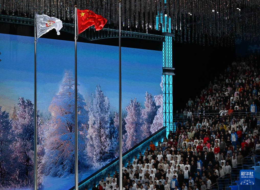 这是2月14日拍摄的闭幕式上的升旗仪式。新华社记者 李一博 摄