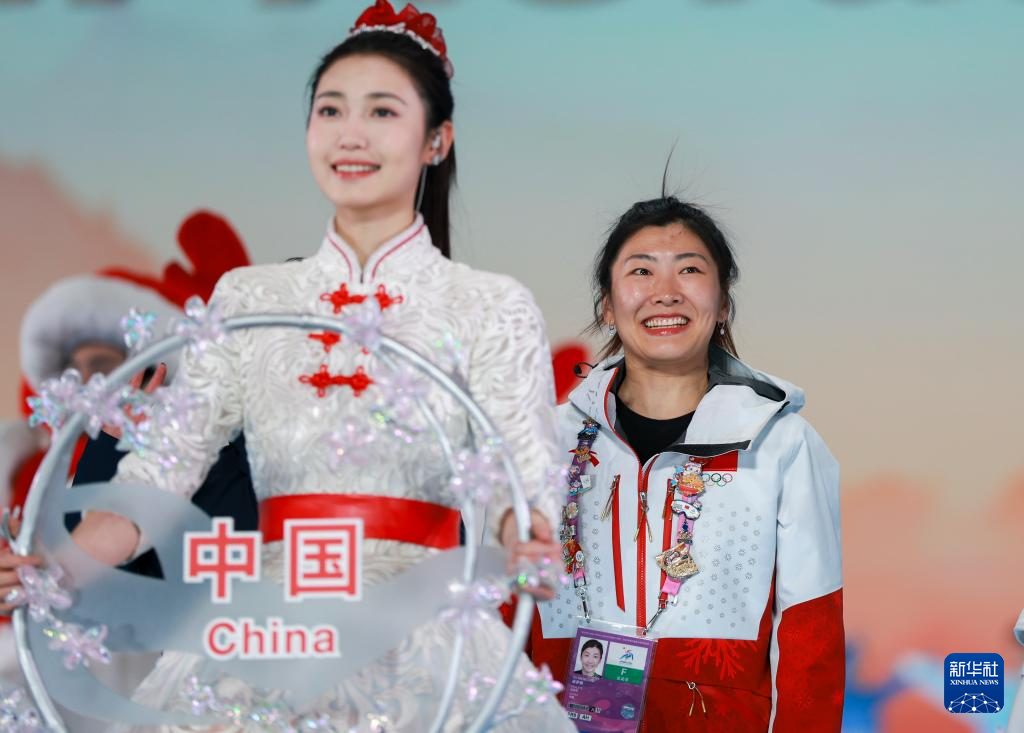 2月14日,中国体育代表团旗手徐梦桃(右)在闭幕式上。新华社记者 许雅楠 摄
