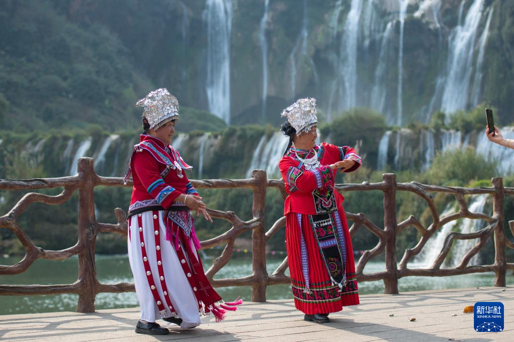 3月10日,游人在云南省曲靖市罗平九龙瀑布群风景区拍照。新华社发(彭奕凯摄)
