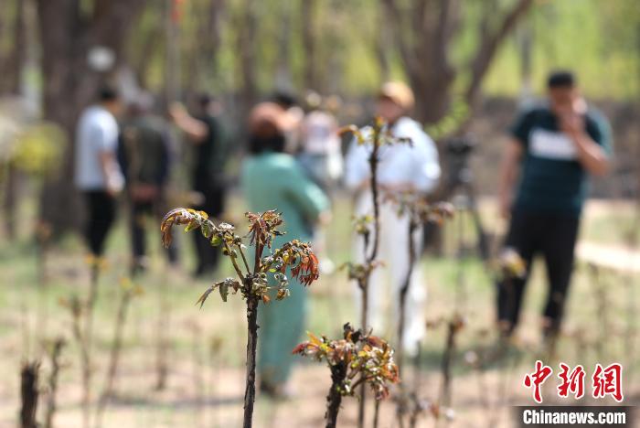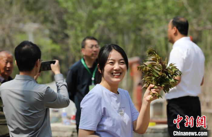 4月17日,游客在大白洋桥村古香椿园展示新采的香椿。田博 摄