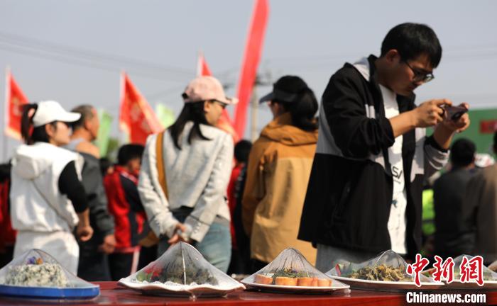 4月17日,游客在大白洋桥村拍摄香椿菜肴样品。田博 摄