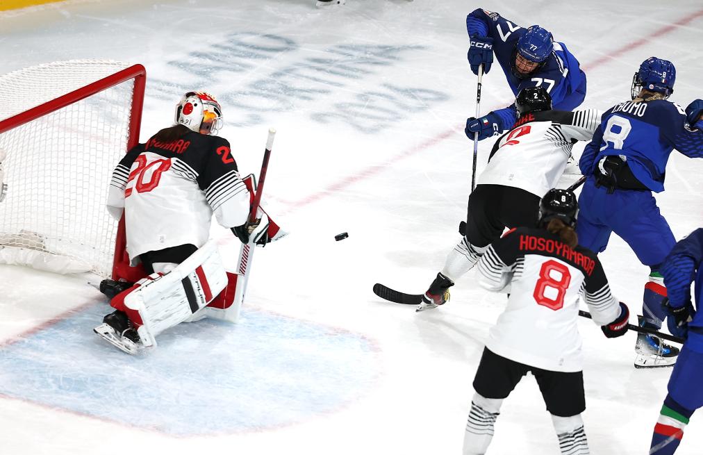 2月9日,意大利队球员劳拉·福尔蒂诺(上)在比赛中射门。新华社记者 孟晨光 摄