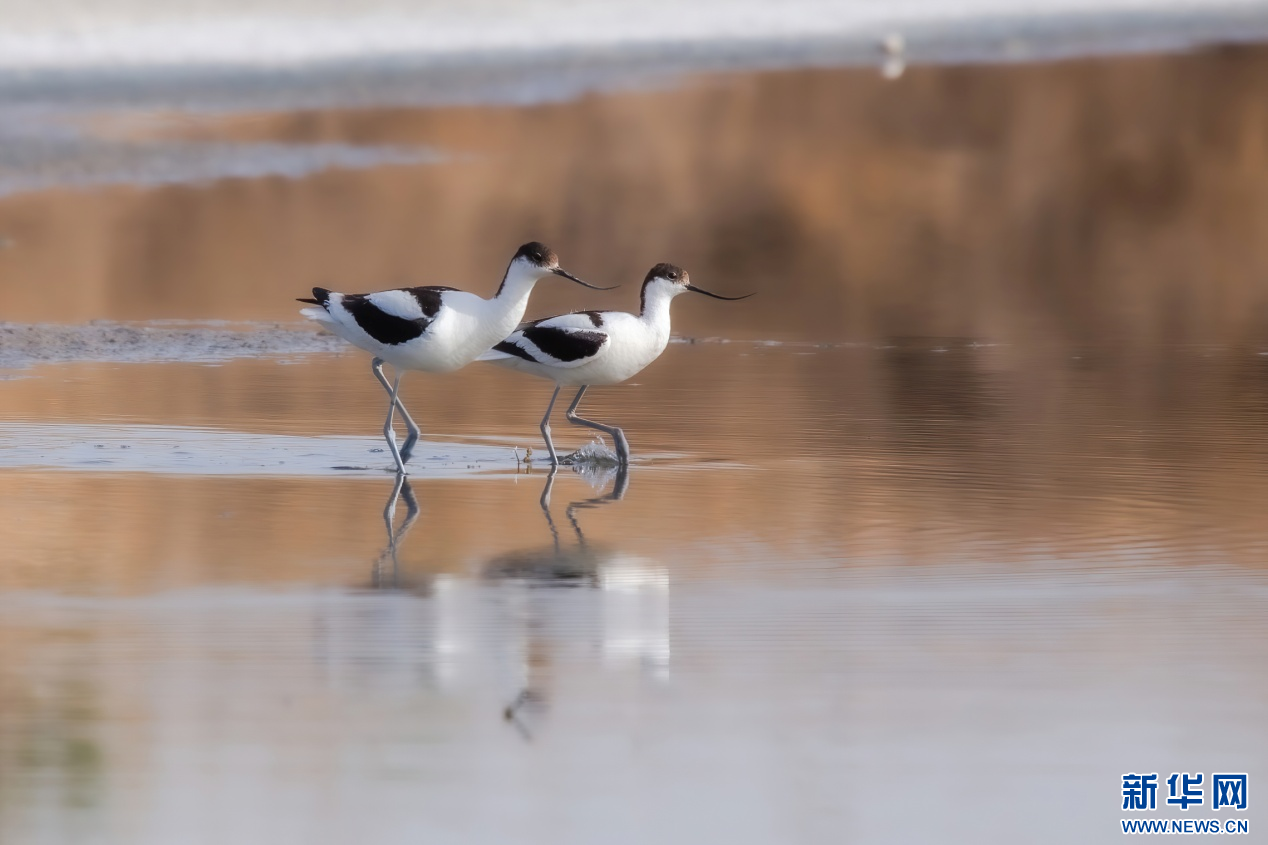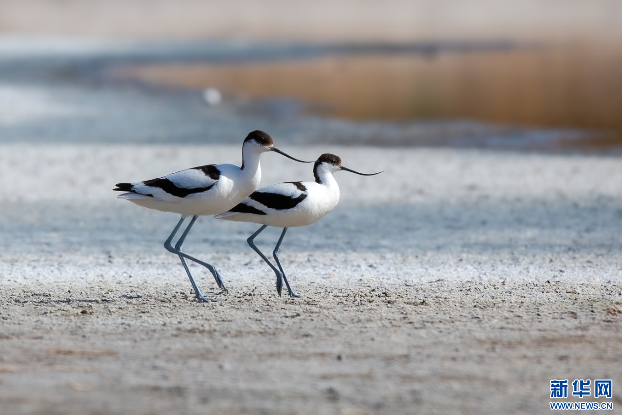两只反嘴鹬在南海湿地行走。新华网发(张颖强 摄)