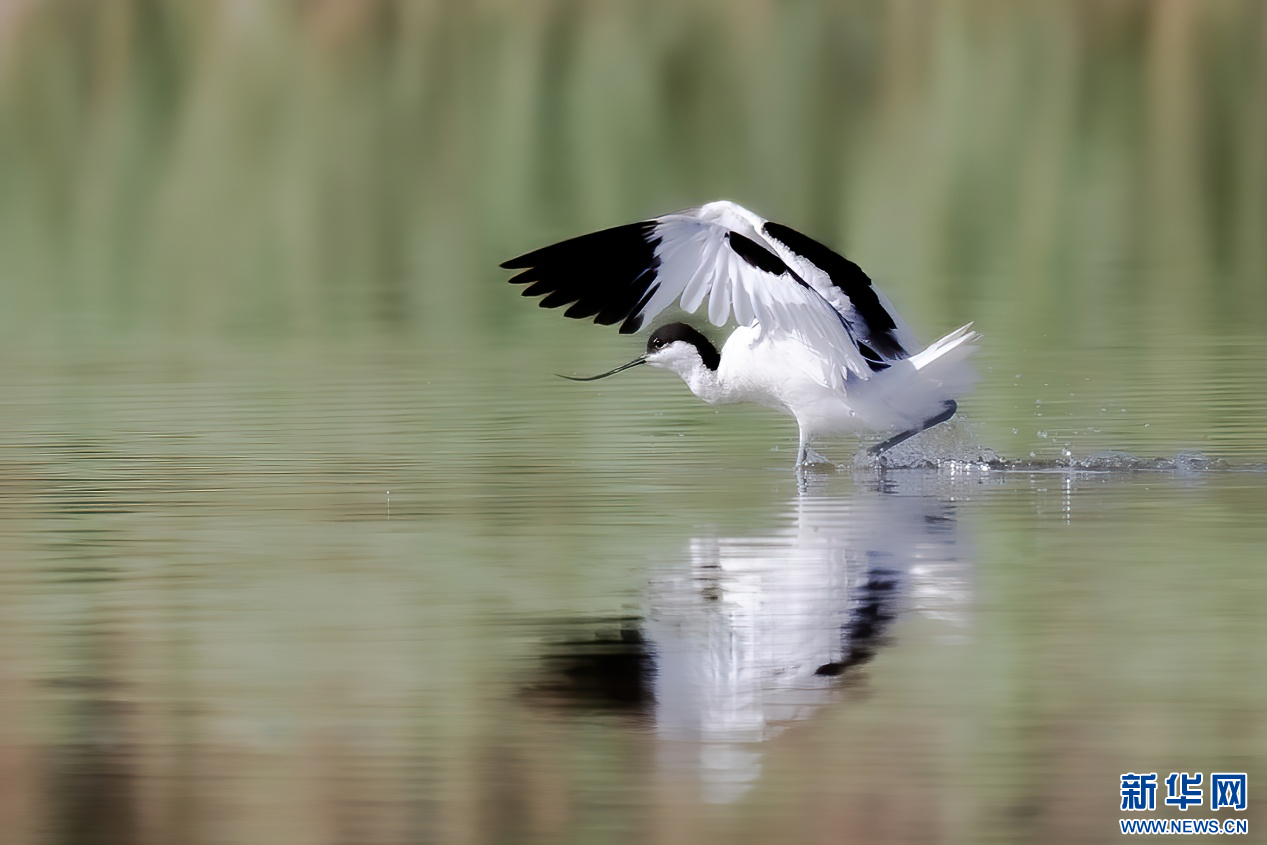 一只反嘴鹬在南海湿地的湖面觅食。新华网发(张颖强 摄)