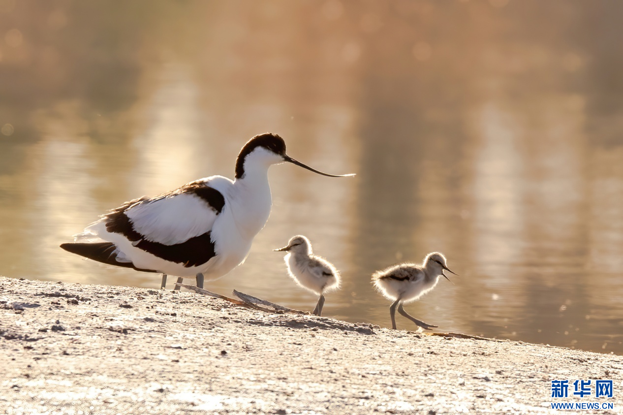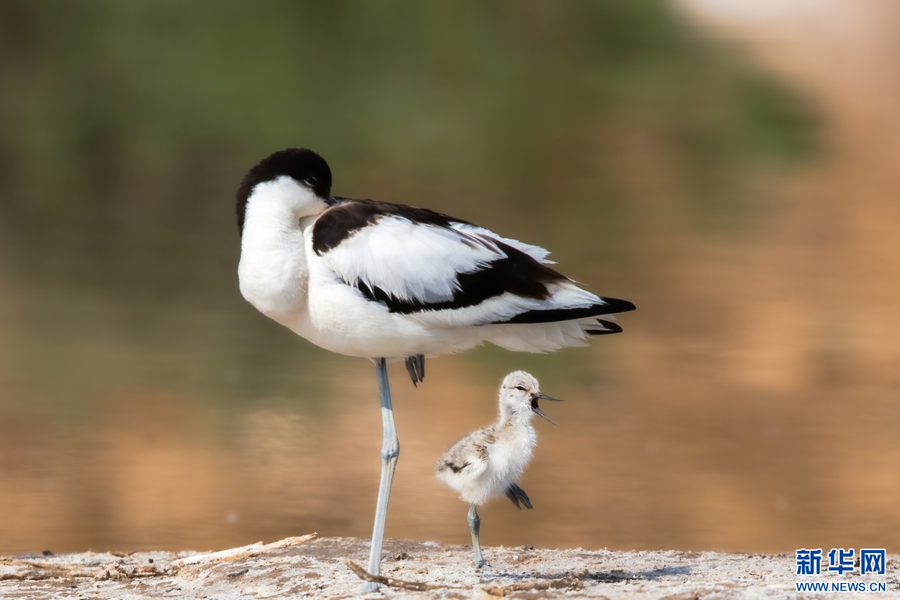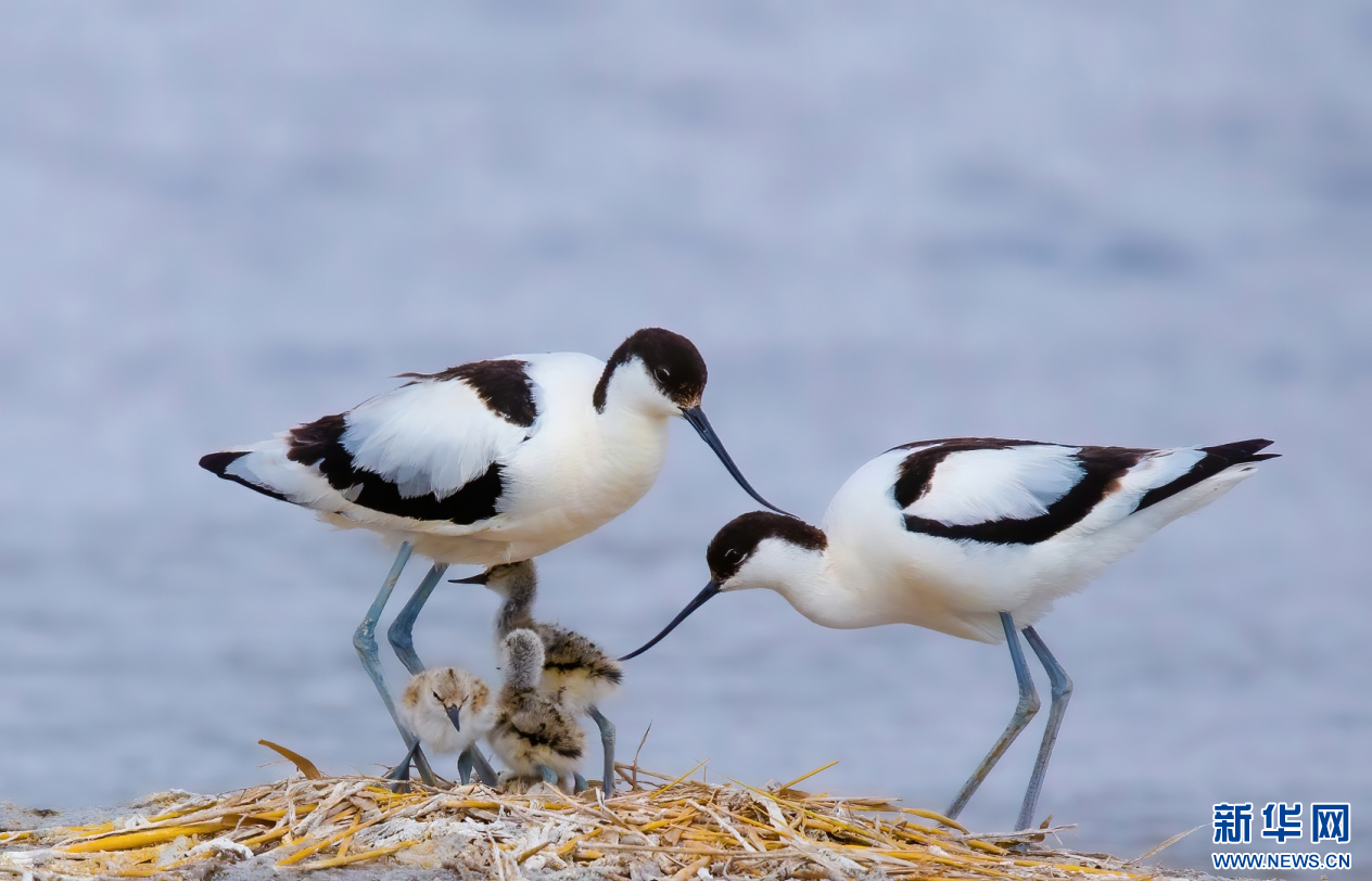 每年5月—7月是反嘴鹬的繁殖季,两只反嘴鹬在南海湿地呵护幼鸟。新华网发(张颖强 摄)