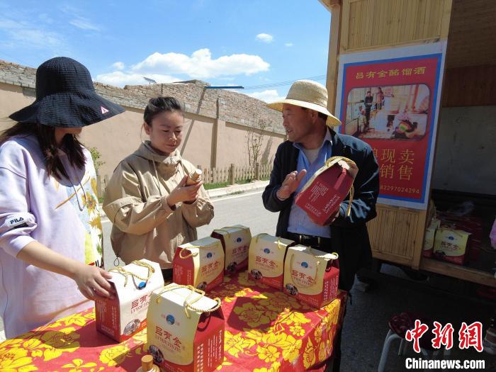 图为班彦村村民吕有金(右一)向游客介绍自家酒坊的青稞酒。马清摄