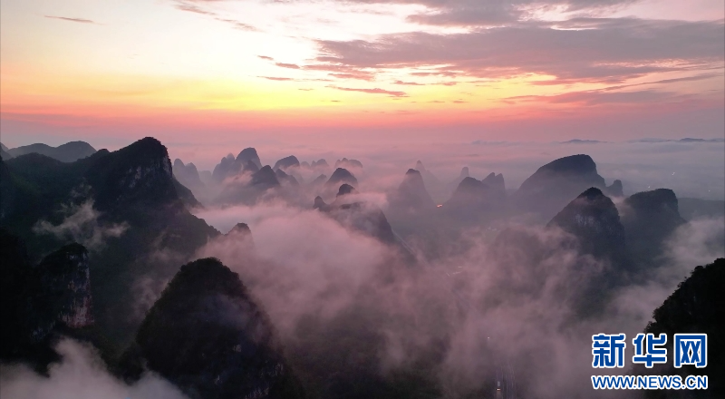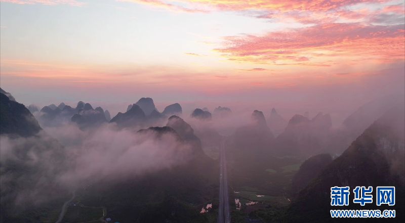近日,在广西贺州市钟山水墨田园景区,日出美如画卷,云雾缭绕其间,唯美之景令人陶醉。