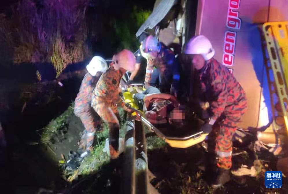 这是6月9日在马来西亚高速公路东西大道霹雳州宜力—吉兰丹州日里路段拍摄的车辆相撞事故现场。新华社发(马来西亚消防救援局供图)