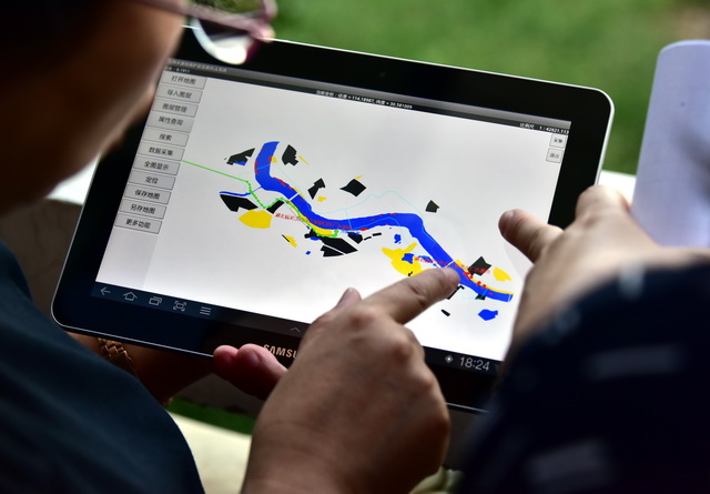 督查人员通过饮用水水源保护区现场巡查卫星遥感支持系统现场检查长江沿岸排污情况。摄影/章轲