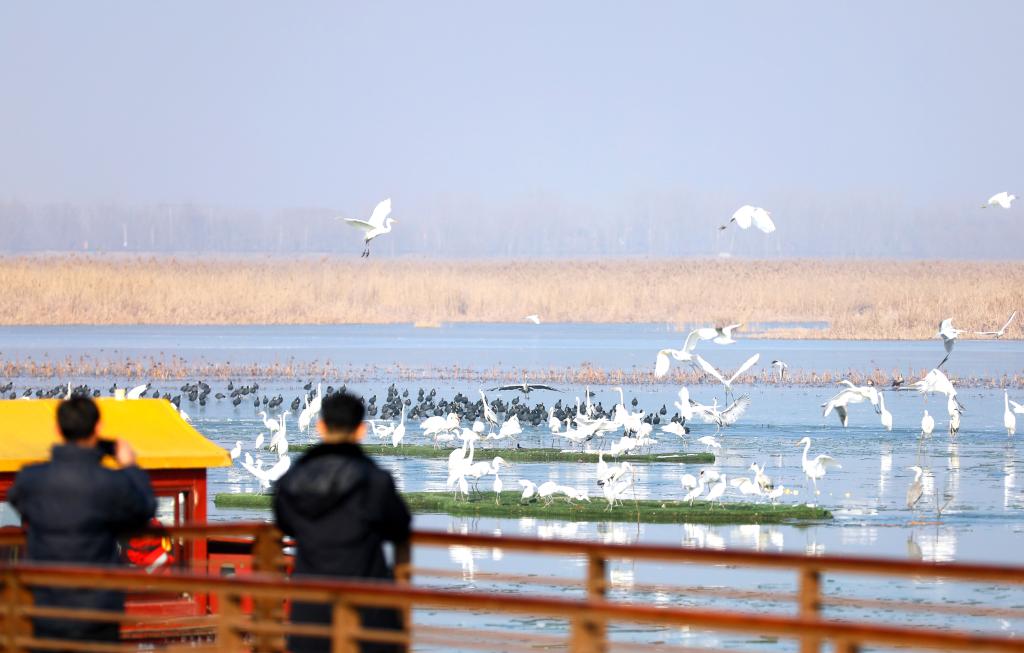 “近年来,当地通过生态补水、湖岸修复、增殖放流等一系列措施,使得湖区水生生物资源日益丰富,为鸟类打造了充足的‘冬日粮仓’。如今,衡水湖观测记录到的鸟类已达337种,每年都有60余种鸟类在此越冬,越冬鸟类数量最高时逾10万只。”张余广说。