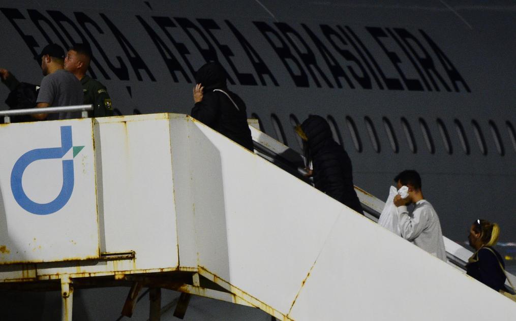2月7日,在巴西东北部塞阿拉州福塔莱萨市,被美国驱逐出境的第二批巴西非法移民登上一架巴西空军飞机。新华社发(卢西奥·塔沃拉摄)